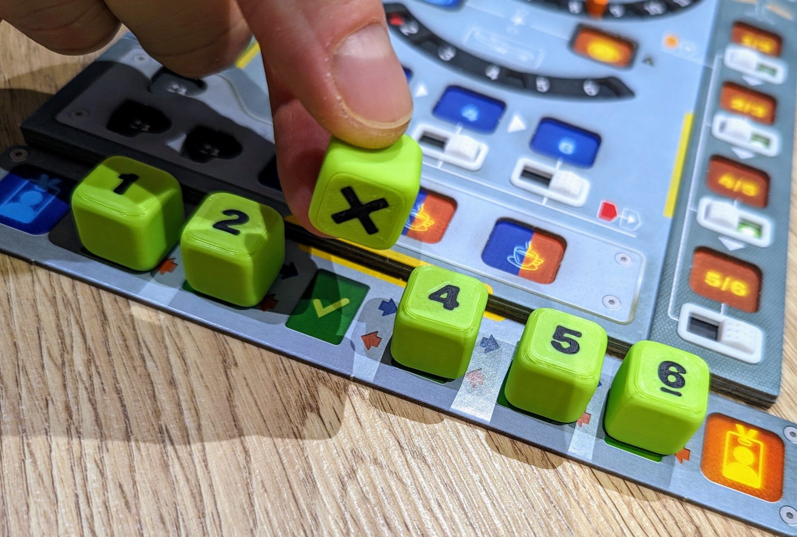 – 6 dés stagiaires verts pour remplacer les pions cartons avec une croix noire en dessous