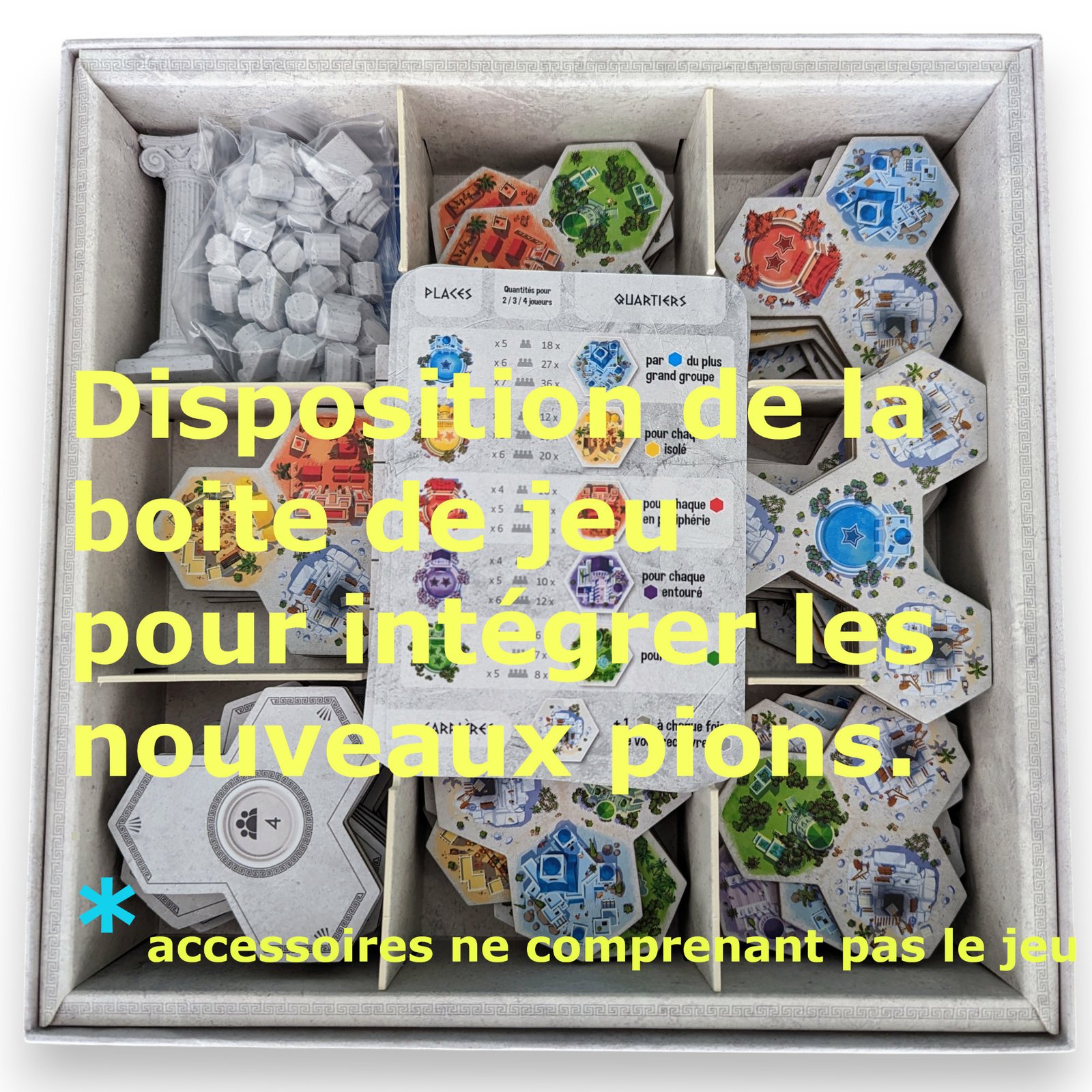 Pièces stylisées pour remplacer les petits cubes fournis avec le jeu, avec la triste colonne en bois… Superbe colonne grecque en remplacement.