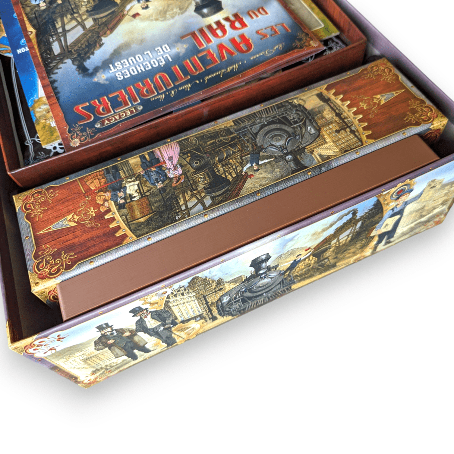Ne contient pas le jeu Les Aventuriers du Rail.Les Aventuriers du Rail est un jeu édité par Days of Wonder. Ce dernier n’assume aucune responsabilité quant aux accessoires et rangements compatibles proposés par FigAmat.